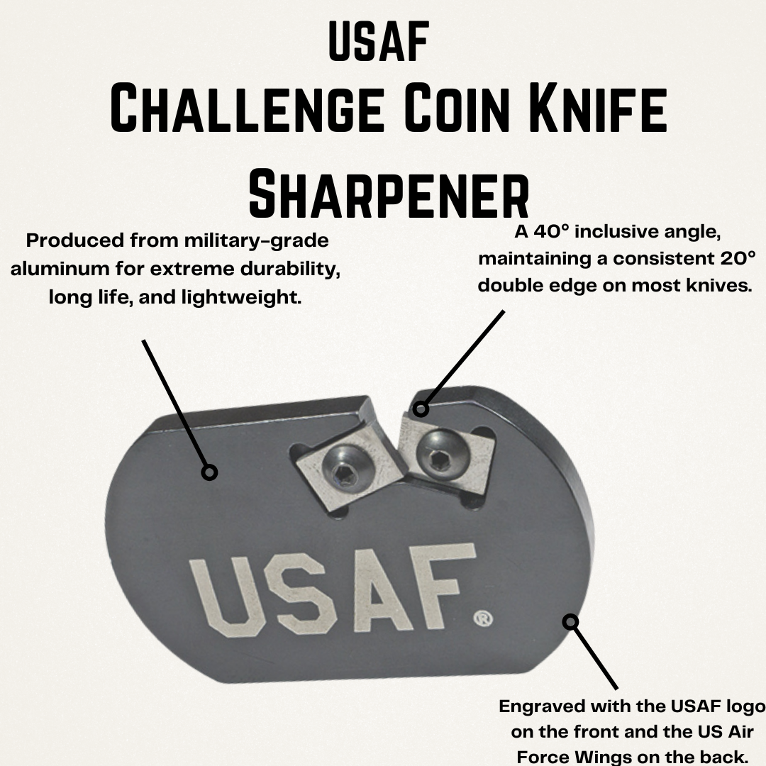 The Redi-Edge® Challenge Coin Knife Sharpener is unmatched in its design and effectiveness. The convenient “challenge coin” design enhances the portability of the sharpener. The Air Force version of the Redi-Edge® Challenge Coin is engraved with the USAF logo on the front and the US Air Force Wings on the back. Color Black. Right Hand orientation.