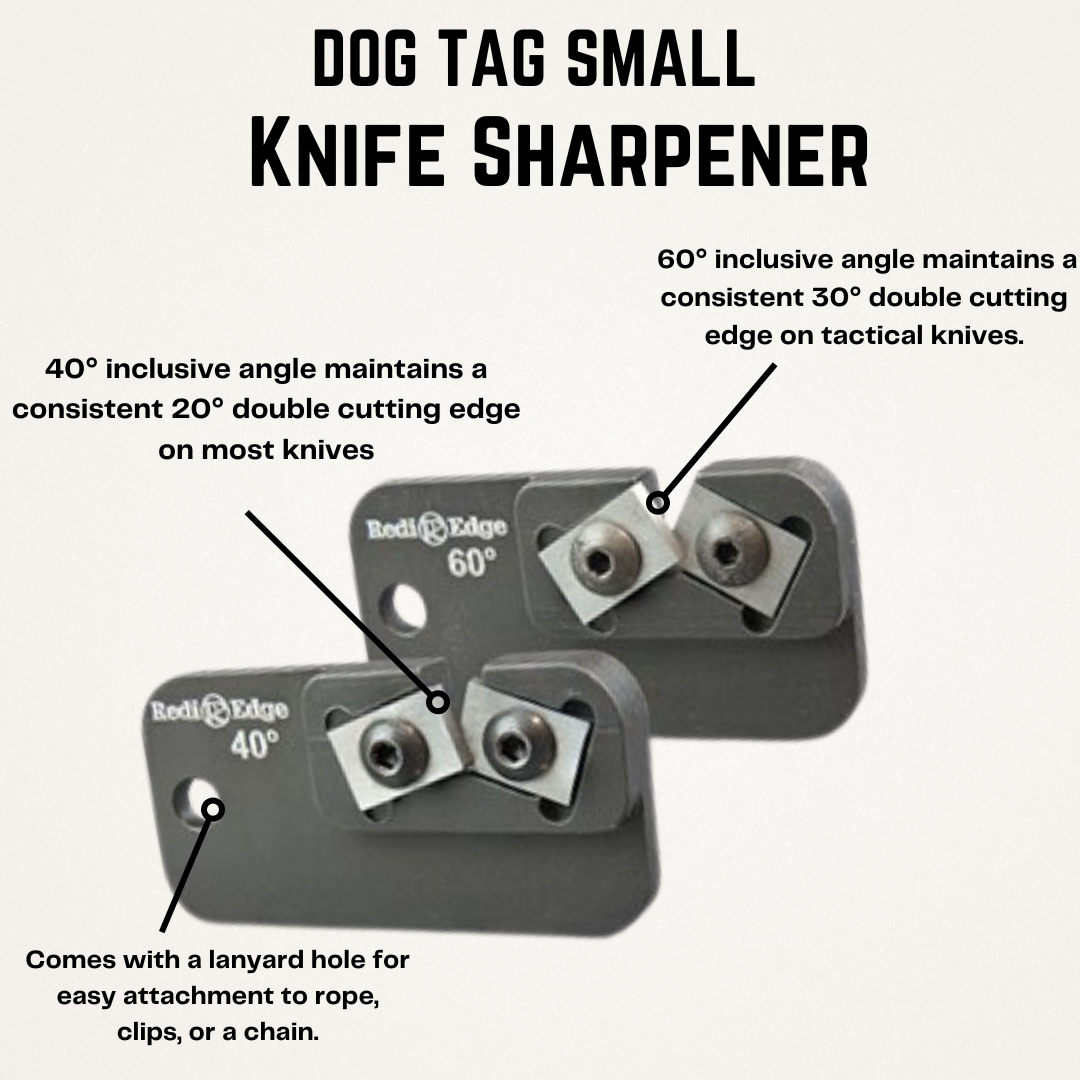 Tough. Dependable. Resilient. The Redi-Edge® Small Dog Tag Knife Sharpener is the most portable, compact, and light weight knife sharpener in the Redi-Edge lineup. Although small, this sharpener still contains the same features such as Duromite™ cutters, additional honing surfaces and a Ceramitized coating that will protect it in the harshest of environments. The Redi-Edge® Small Dog Tag is factory-set at a 40° or a 60° angle. The 40° inclusive angle maintains a consistent 20° double cutting edge on most knives and the 60° inclusive angle maintains a consistent 30° double cutting edge on tactical knives. Sharpens, polishes & hones all in one!