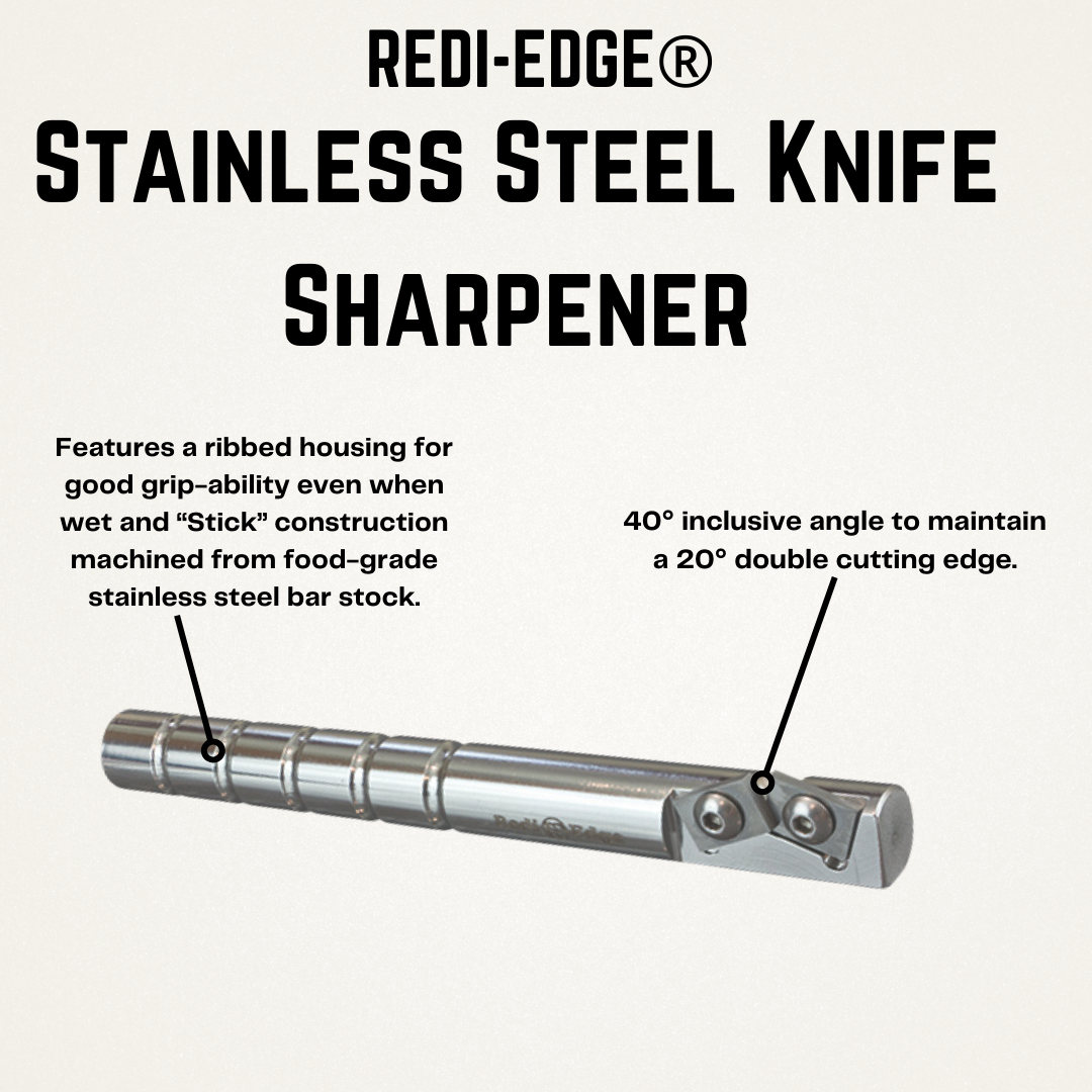 The Redi-Edge® Stainless Steel Knife Sharpener is a “must-have” for any kitchen and is member tested & approved by the Cooking Club of America! The convenient “stick” design gives you a sturdy grip while you use the Duromite™ cutters to put the perfect edge on your knife every time. The Redi-Edge® Original Stainless Steel Sharpener comes factory-set at a 40° inclusive angle, maintaining a consistent 20° double edge on your knives. If you hold your knife in your right hand while cutting, order a right-handed sharpener. If you hold your knife in your left hand while cutting, order a left-handed sharpener.